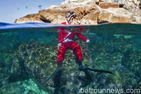 على الرغم من الظروف الصعبة التي ترزح تحتها البلاد هذه الأيّام، يحاول بعض اللبنانيين عيش فرحة الأعياد، كلّ على طريقته. بعيداً عن شراء الهدايا والملابس والتفنّن بالزينة والأطباق، هناك من قرّر الإفادة من دفء الطقس هذه الأيّام في سبيل هذه الغاية. مثلاً، ارتدى غطّاس لبناني أخيراً زي بابا نويل وراح يستمتع بمياه بحر البترون (شمال لبنان) الباردة وحرارة الشمس الساطعة (إبراهيم شلهوب ــ أ ف ب)