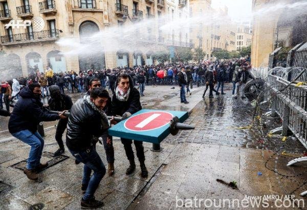 وأظهرت مشاهد تلفزيونية مباشرة قيام قوات الأمن اللبنانية باستخدام مدافع المياه اليوم ضد متظاهرين كانوا يرشقونها بكل ما تقع أيديهم عليه قرب مبنى البرلمان وسط بيروت.