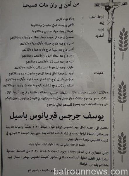 وفاة “يوسف جرجس قبريانوس باسيل” – سمار جبيل
