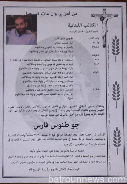 Posted on 7 فبراير، 2020 by adminالكتائب اللبنانية تنعي الشاب “جو طنوس فارس” والدفن يوم السبت أخبار البترون, وفيات