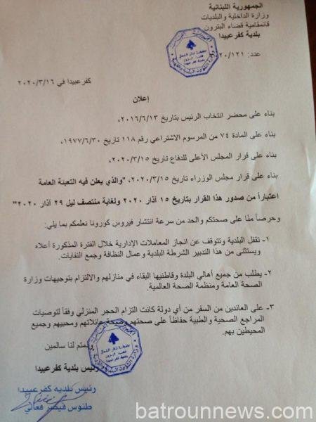 بلدية كفرعبيدا تطلب من الأهالي البقاء في المنازل