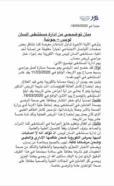وأوضحت في بيان: “لقد خضع أحد المرضى وهو بصحة ممتازة لعمل جراحي بسيط صباح يوم الاربعاء الواقع في 11/03/2020 وقد غادر المستشفى في اليوم نفسه. وتبين بعد يومين أن زوجته مصابة بالكورونا وهي قيد العلاج. وبعد إخضاع كامل العائلة للفحوصات، اتت نتيجة المريض المذكور إيجابية وهو لا يعاني من أية أعراض حتى تاريخه وقد أبلغ المستشفى بالموضوع يوم الاثنين الواقع في 16/03/2020.” وأضافت: “تحسّباً لأي خطر انتشار وحفاظاً على صحة المرضى وصحة العاملين في المستشفى وبعد إحاطة خلية الازمة لدى وزارة الصحة بالأمر وعملاً بارشاداتها، تمّ حجر كامل الطاقم الطبي الذي كان يعمل يوم إخضاع هذا المريض للعملية وذلك لمدة خمسة عشر يوماً من تاريخه، وتم اقفال وتعقيم طابق الجراحة في المستشفى كما الممرات والمصاعد وغرف العمليات وفقاً للاصول الطبية والعلمية.” وأكدت إدارة مستشفى السان لويس أن لا اصابات لديها بمرض الكورونا ضمن طاقمها الاداري والطبي وضمن مرضاها كافة.