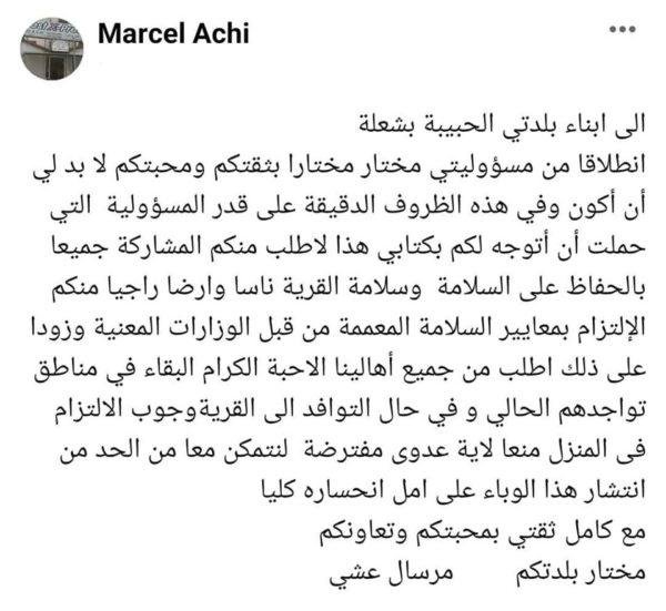 نداء من مختار بشعلة الى الاهالي للإلتزام بمعايير السلامة العامة