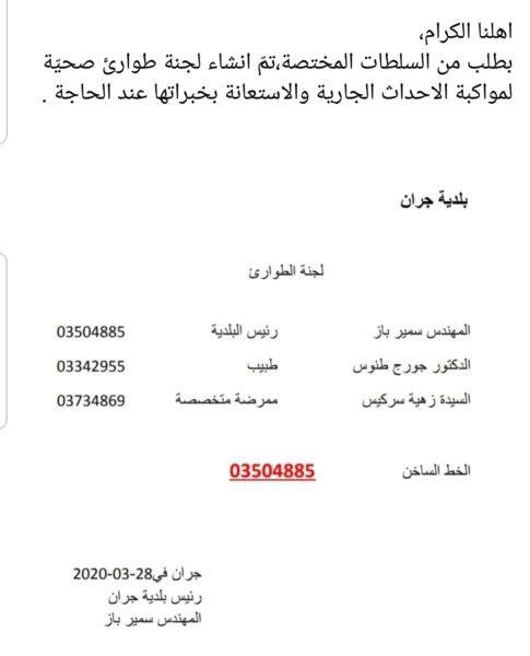 إنشاء لجنة طوارئ صحية في بلدة جران