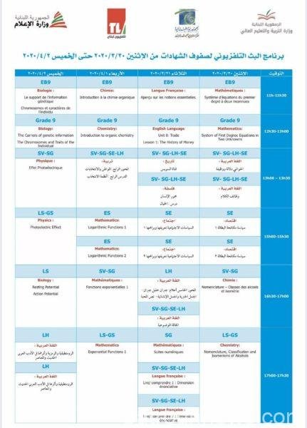 أعلنت وزارة التربية والتعليم العالي، بالتعاون مع وزارة الإعلام والمركز التربوي للبحوث والإنماء، في بيان، “بدء البث التلفزيوني لصفوف الشهادات اليوم، عبر أثير تلفزيون لبنان وفق البرنامج المرفق”.