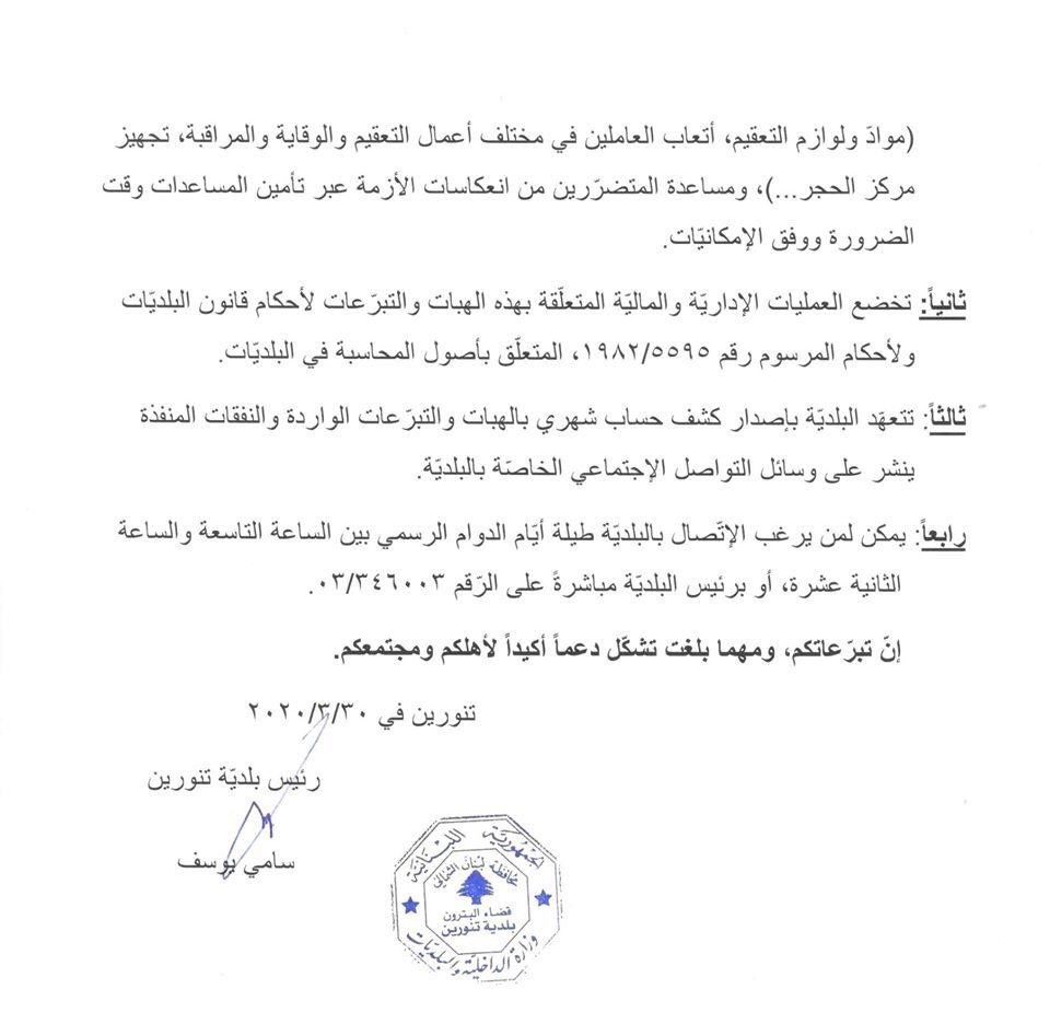 بيان عن بلدية تنورين ينظم الهبات والتبرعات النقدية