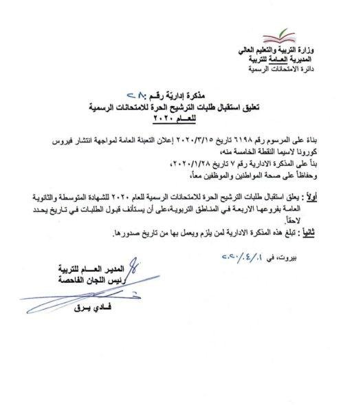 Posted on 1 أبريل، 2020 by adminوزارة التربية تعلق إستقبال طلبات الترشيح الحرة للامتحانات الرسمية للعام 2020 أصدرت المديرية العامة لوزارة التربية والتعليم العالي المذكرة رقم 28، حول تعليق إستقبال طلبات الترشيح الحرة للامتحانات الرسمية للعام 2020. لبنان