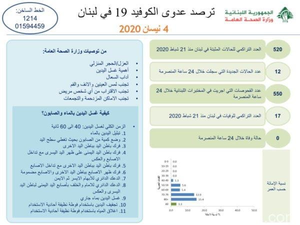 أعلنت وزارة الصحة العامة أنه حتى تاريخ 4/4/2020 بلغ عدد الحالات المثبتة مخبرياً في مستشفى الحريري الجامعي ومختبرات المستشفيات الجامعية المعتمدة بالإضافة إلى المختبرات الخاصة 520 حالة بزيادة 12 حالة عن يوم امس، علما ان عدد الفحوصات التي أجريت في الساعات الأربع والعشرين الماضية بلغ 550 فحصا.
