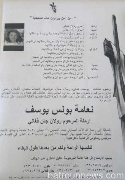 وفاة نعامة بولس يوسف – كفرعبيدا