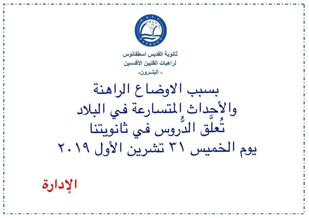 Posted on 30 أكتوبر، 2019 by adminلا دروس غداً في مدرسة القلبين الاقدسين البترونوصلت رسائل نصية الى اولياء الطلاب انه لا دروس غداً الخميس ٣١ تشرين الأول ٢٠١٩ في مدرسة القلبين الاقدسين البترون عاجل