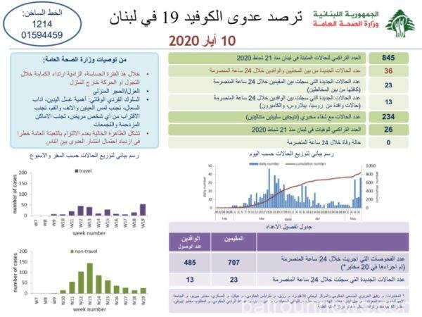Posted on 10 مايو، 2020 by adminكورونا..الصحة: 36 اصابة جديدة في لبنان أصدرت وزارة الصحة تقريرها اليومي عن فيروس كورونا وجاء فيه: لبنان