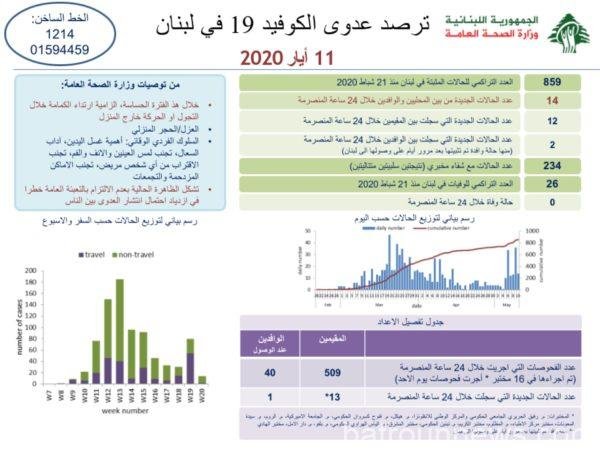 Posted on 11 مايو، 2020 by adminكورونا.. الصحة: 14 اصابة جديدةأصدرت وزارة الصحة تقريرها اليومي عن فيروس كورونا وجاء فيه: لبنان