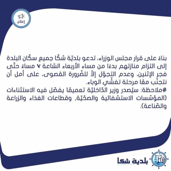 بعد قرار الحكومة.. دعوة من بلدية شكا