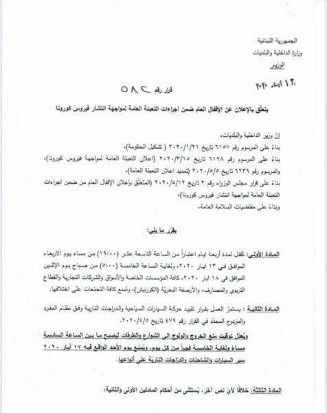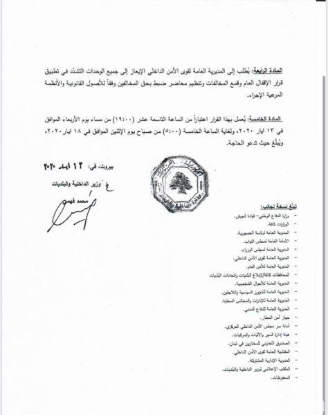 Posted on 13 May، 2020 by adminقرار لوزير الداخلية يتعلق بإعلان الاقفال العامأصدر وزير الداخلية والبلديات العميد محمد فهمي قرارا يتعلق بإعلان الاقفال العام، جاء فيه: لبنان