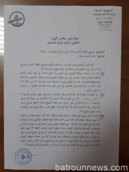وفيهذا الصدد، بعثت بلدية سلعاتا رسالة الى رئيس الحكومة حسان دياب لتوضيح اللغط الحاصل بشأن معمل لإنتاج الكهرباء في سلعاتا.