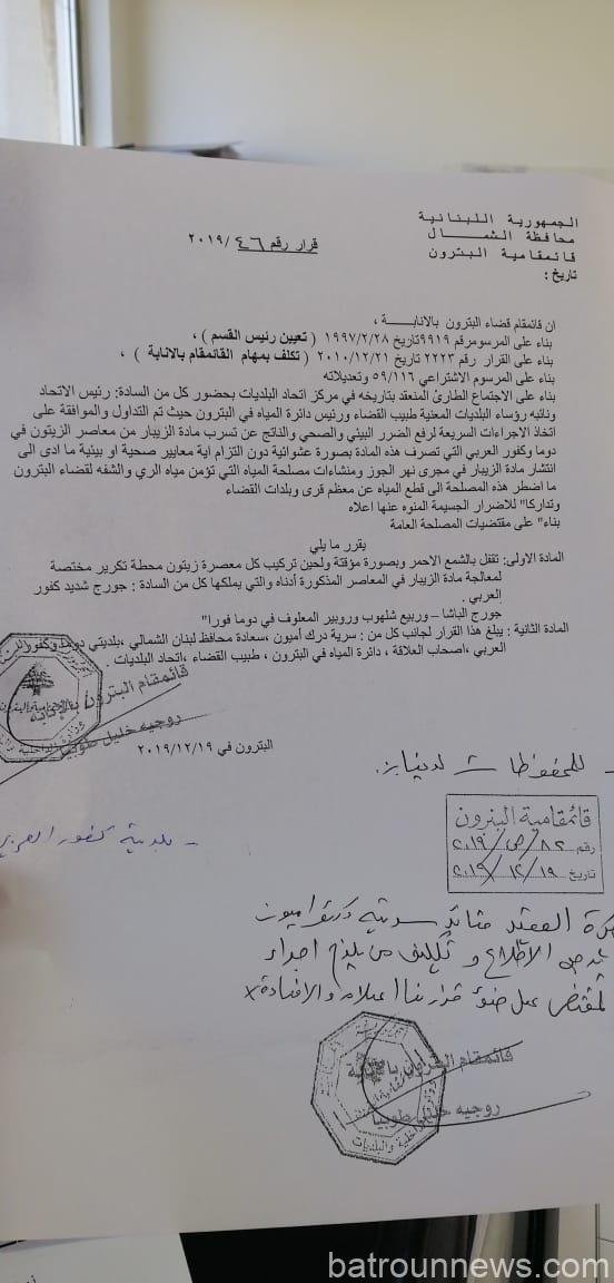 وبنتيجة الاجتماع اتخذ قائمقام البترون قرارا قضى بإقفال معاصر الزيتون في كفور العربي ودوما بصورة مؤقتة ولحين تركيب محطة تكرير مختصة بمعالجة مادة الزيبار في المعاصر.