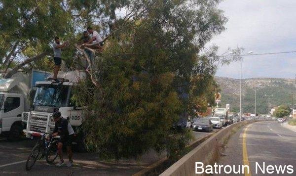 Posted on 19 يونيو، 2020 by adminبالصورة: شجرة في البترون تقفل أوتوستراد طرابلسسقطت شجرة ضخمة أمس على احدى الشاحنات على المسلك الغربي لاوتوستراد طرابلس بيروت في بلدة كبا قبل مفترق مدينة البترون، مما أدى إلى قطع الطريق وتسبب بزحمة سير خانقة و يعمل بعض المارة على تقطيع الاغصان ورفعها في محاولة لفتح الطريق. أخبار البترون