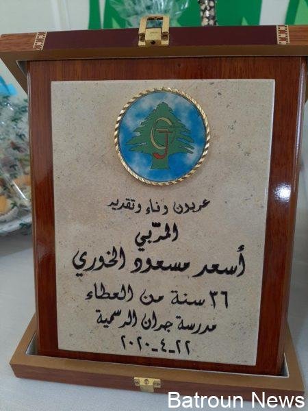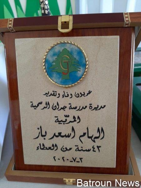 كرمت المديرة الجديدة لمدرسة جران الرسمية روز يوسف يوسف المديرة السابقة إلهام أسعد باز وكلا من أسعد مسعود الخوري وليلى أديب الخوري لبلوغهم السن القانونية وإحالتهم على التقاعد وذلك خلال حفل أقيم في قاعة الاجتماعات في المدرسة في حضور أفراد الهيئتين الادارية والتعليمية.