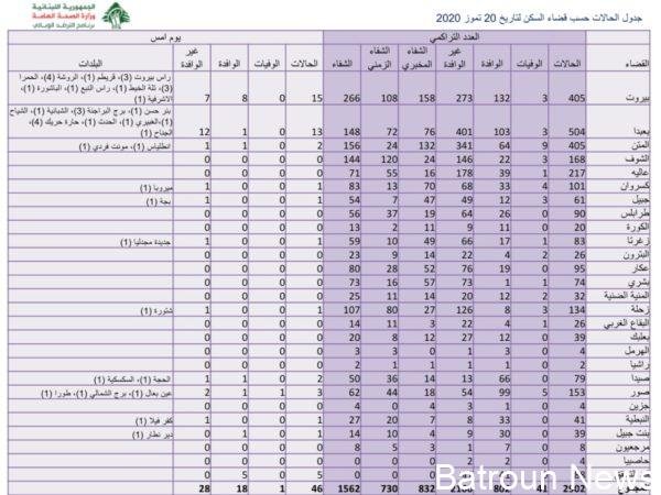 Posted on 20 يوليو، 2020 by adminتقرير وزارة الصحة: لا إصابات في البترون و 46 اصابة كورونا جديدة في لبناناعلنت وزارة الصحة العامة تسجيل 46 اصابة كورونا جديدة رفعت العدد التراكمي للحالات المثبتة الى 2905. وعلى صعيد قضاء البترون، فلا إصابات في البترون حسب الوزارة.وجاء في التقرير: أخبار البترون