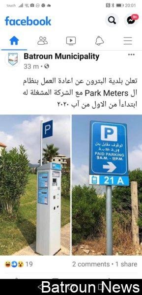 Posted on 20 يوليو، 2020 by adminإعادة العمل بنظام Park Meters في مدينة البترونأعلنتت بلدية البترون عبر فيسبوك عن قرارها إعادة العمل بنظام ال Park Meters بداية من 1 آب 2020 .مع العلم ان هذا النظام كان قد توقف بعد إنطلاق ثورة 17 تشرين. أخبار البترون