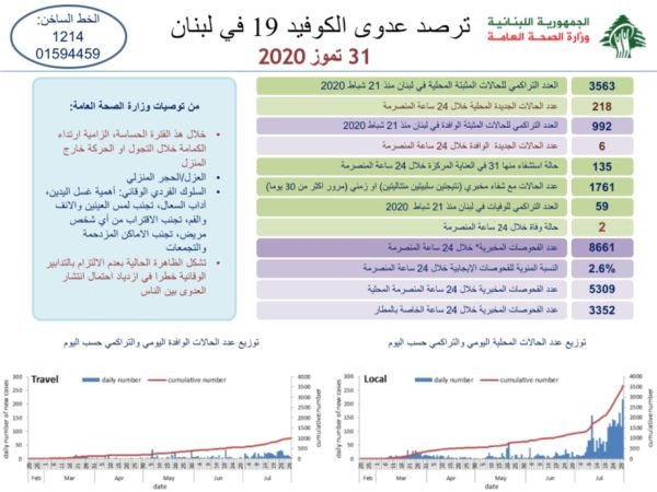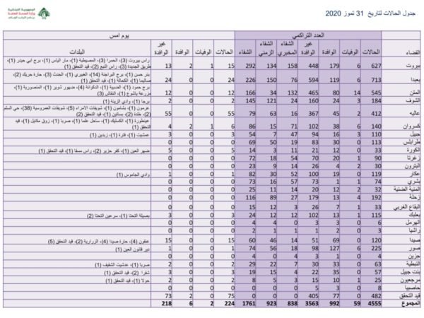 Posted on 31 يوليو، 2020 by adminالصحة: 224 اصابة كورونا اليوم.. ماذا عن البترون؟اعلنت وزارة الصحة العامة تسجيل 224 إصابة كورونا جديدة رفعت العدد التراكمي للحالات المثبتة الى 4555، اما عن منطقة البترون فلا إصابات حديدة حسب التقرير.وجاء في التقرير: أخبار البترون