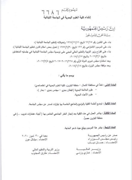 Posted on 2 أغسطس، 2020 by adminنص مرسوم إنشاء كلية للعلوم البحرية في الجامعة اللبنانية مركزها البترون أخبار البترون