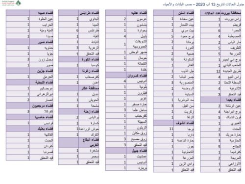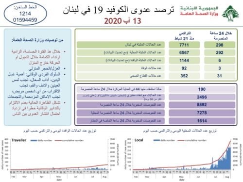 Posted on 13 أغسطس، 2020 by adminلا إصابات في البترون.. كورونا: 298 اصابة في لبنان… تفاصيل المناطقسجلت وزارة الصحة العامة 298 اصابة كورونا جديدة رفعت العدد , التراكمي منذ ٢١ شباط الماضي الى 7711 حالة. وحسب الجدول لا اصابات جديدة في البترون.وجاء في تقريرها: أخبار البترون