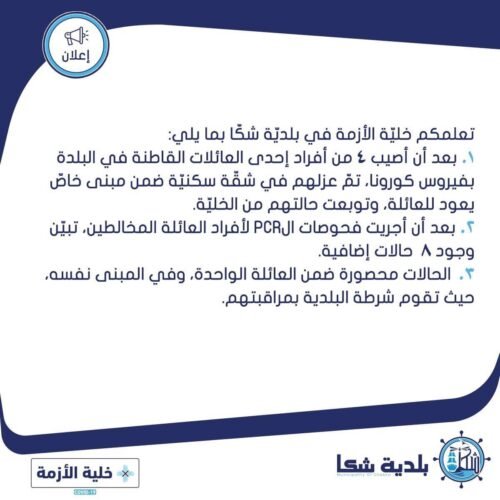 أكدت خلية الأزمة في بلدية شكا متابعة كل الحالات التي ظهرت في البلدة وأشارت الى أنه “بعد إصابة 4 من أفراد إحدى العائلات التي تسكن في البلدة تم عزلهم في شقة سكنية داخل مبنى خاص بالعائلة في ظل متابعة الخلية. وبعد إجراء فحوصات لأفراد العائلة المخالطين تبين وجود 8 حالات إضافية ما رفع العدد ضمن العائلة الواحدة إلى 12 إصابة. وتقوم شرطة البلدية بمراقبة أفراد العائلة المتواجدين ضمن مبنى واحد.
