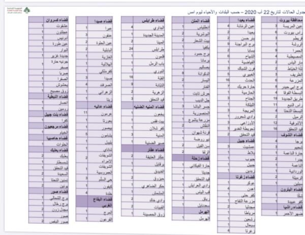 Posted on 22 أغسطس، 2020 by adminكورونا اليوم: هكذا توزعت ال 611 إصابة .. ماذا عن البترون؟سجلت وزارة الصحة العامة 611 اصابة كورونا جديدة رفعت العدد التراكمي منذ ٢١ شباط الماضي الى 12191 حالة، وفي قضاء اليترون سجلت إصابتين، واحدة في كفرعبيدا وأخرى في شكا.وجاء في تقريرها: أخبار البترون
