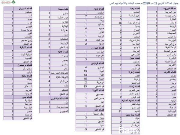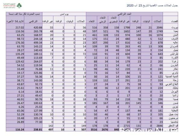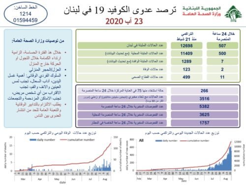 أعلنت وزارة الصحة العامة تسجيل 507 إصابات جديدة بفيروس كورونا إضافة الى حالتي وفاة خلال الساعات الـ24 الماضية. وسجلت في التقرير 5 إصابات في منطقة البترون ثلاث في شكا، واحدة كفرعبيدا و واحدة في مدينة البترون.