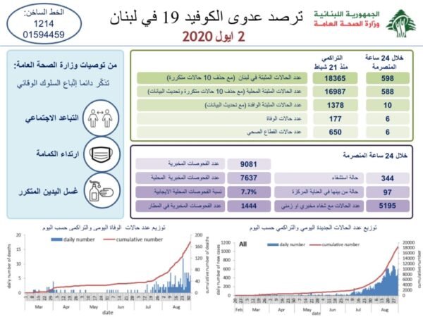 اعلنت وزارة الصحة العامة تسجيل 598 اصابة كورونا جديدة رفعت العدد التراكمي للحالات المثبتة الى 18375 .