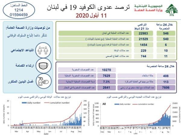 أعلنت وزارة الصحة العامة تسجيل 546 اصابة كورونا جديدة رفعت العدد التراكمي منذ 21 شباط الماضي الى 22983 حالة.