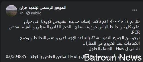Posted on 24 September، 2020 by adminكورونا: اصابة جديدة في جرانارشيفية أعلنت بلدية جران عن إصابة جديدة بفيروس كورونا. وورد على حساب البلدية عبر فيسبوك: أخبار البترون