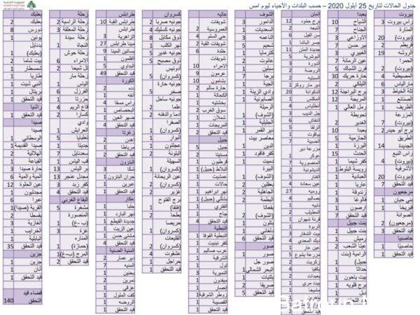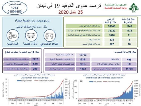 أعلنت وزارة الصحة العامة تسجيل 1143 اصابة كورونا جديدة رفعت العدد التراكمي منذ 21  شباط الماضي الى 33962 حالة.