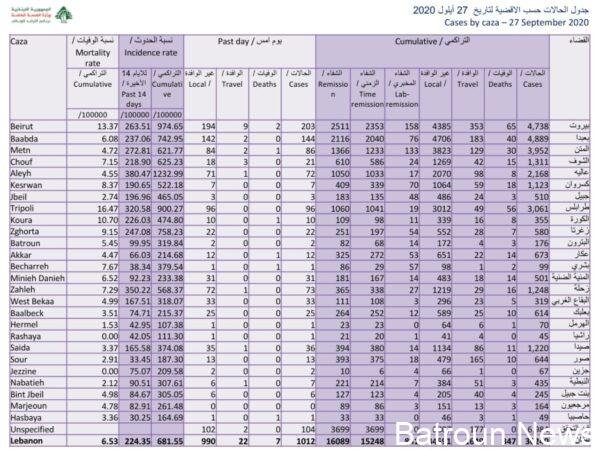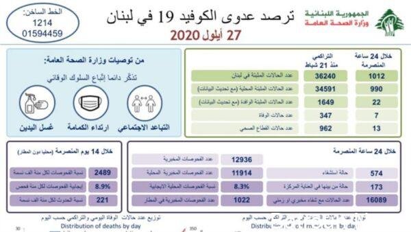 Posted on 27 سبتمبر، 2020 by adminوزارة الصحة: 1012 اصابة كورونا.. ماذا عن البترونأعلنت وزارة الصحة العامة تسجيل 1012 اصابة كورونا جديدة رفعت العدد التراكمي منذ 21 شباط الماضي الى 36240 حالة.وجاء في تقريرها: أخبار البترون