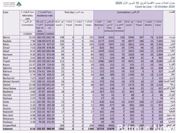 اعلنت وزارة الصحة العامة تسجيل 1388 اصابة كورونا جديدة رفعت العدد التراكمي للحالات المثبتة الى 52,558