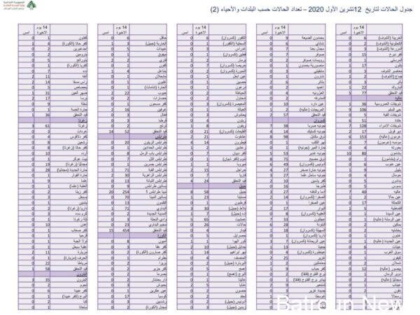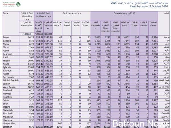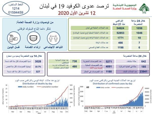 أعلنت وزارة الصحة العامة اللبنانية في تقريرها اليومي حول مستجدات فيروس أن الإصابات الجديدة هي بواقع 1046 من بين المقيمين و10 من بين الوافدين اللبنانيين من الخارج. وأضافت أنه تم تسجيل 7 حالات وفاة جديدة في 24 ساعة.