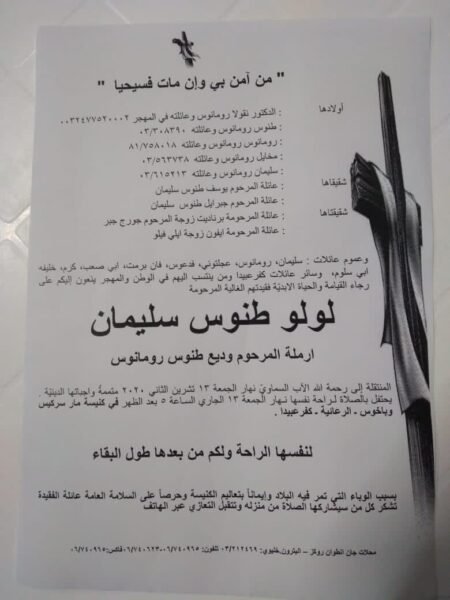 وفاة لولو طنوس سليمان – كفرعبيدا