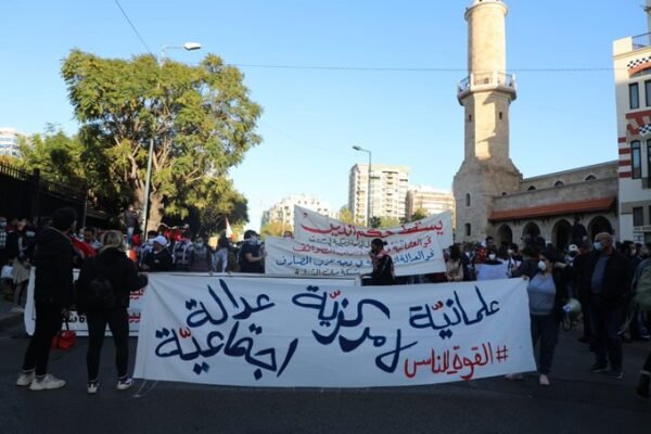 وحمل المشاركون لافتات كتب عليها: «نحو العلمانية في وجه أحزاب الطوائف ونحو العدالة الاجتماعية» ولافتة تحمل شعار «معا من أجل حكومة انتقالية إنقاذية».