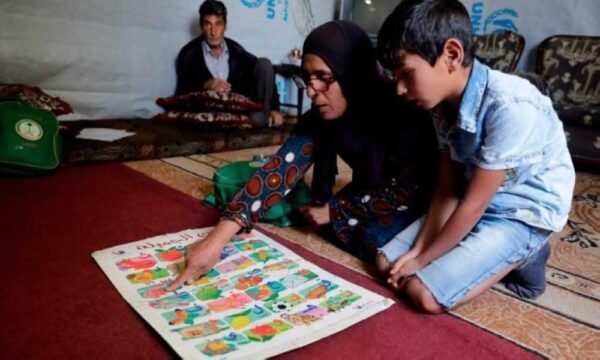 وتُكرر على مسامع ابنها الأحرف وتعطيه أمثلة عليها «ألف، أرنب» لكنها تقول أن ما تقوم به أمس هو أقصى ما يُمكنها فعله.