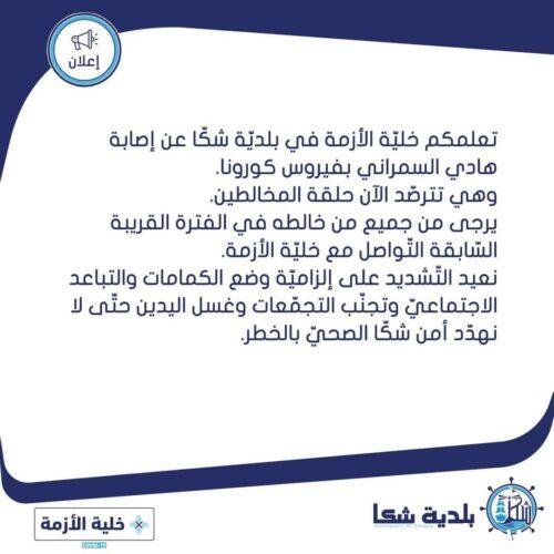 كورونا: اصابة جديدة بالفيروس في بلدة شكا أفادت خلية الازمة في بلدية شكا عن اصابة المواطن ك.ن بفيروس كورونا، علما انه كان خاضعا للحجر المنزلي منذ...