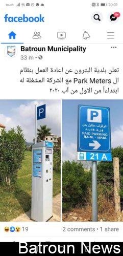 إعادة العمل بنظام Park Meters في مدينة البترون أعلنتت بلدية البترون عبر فيسبوك عن قرارها إعادة العمل بنظام ال Park Meters بداية من 1 آب 2020 .مع...