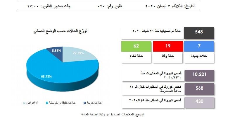كورونا: تقرير غرفة إدارة الكوارث بلغ عدد الإصابات بفيروس كورونا (covid-19) في لبنان 548 حالة، مع استقرار عدد الوفيات على 19 حالة، فيما ارتفع...