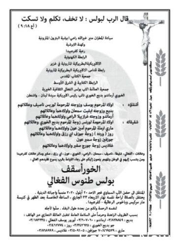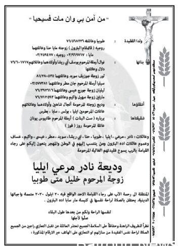 توفي المختار السابق في يلدة عبداللي جرجس دوميط يونس يصلى على جثمانه اليوم الاثنين التعازي على الارقام التاليةطنوس ٠٠٣٣٦٨٥١٢٣٨١٧ايلي...