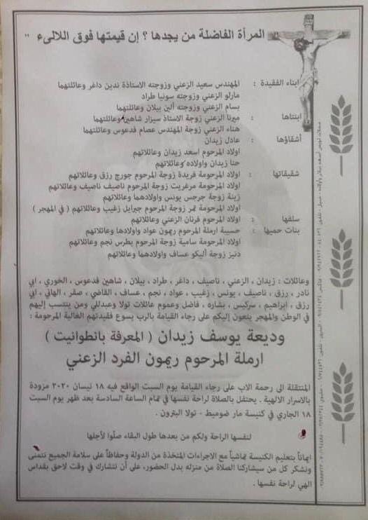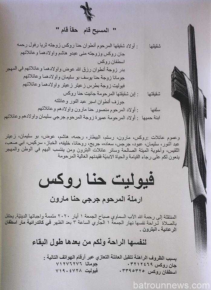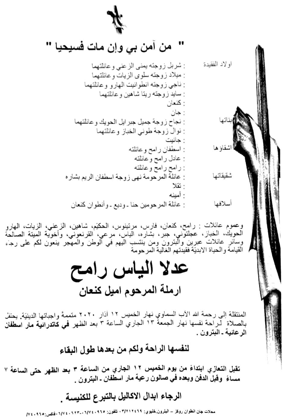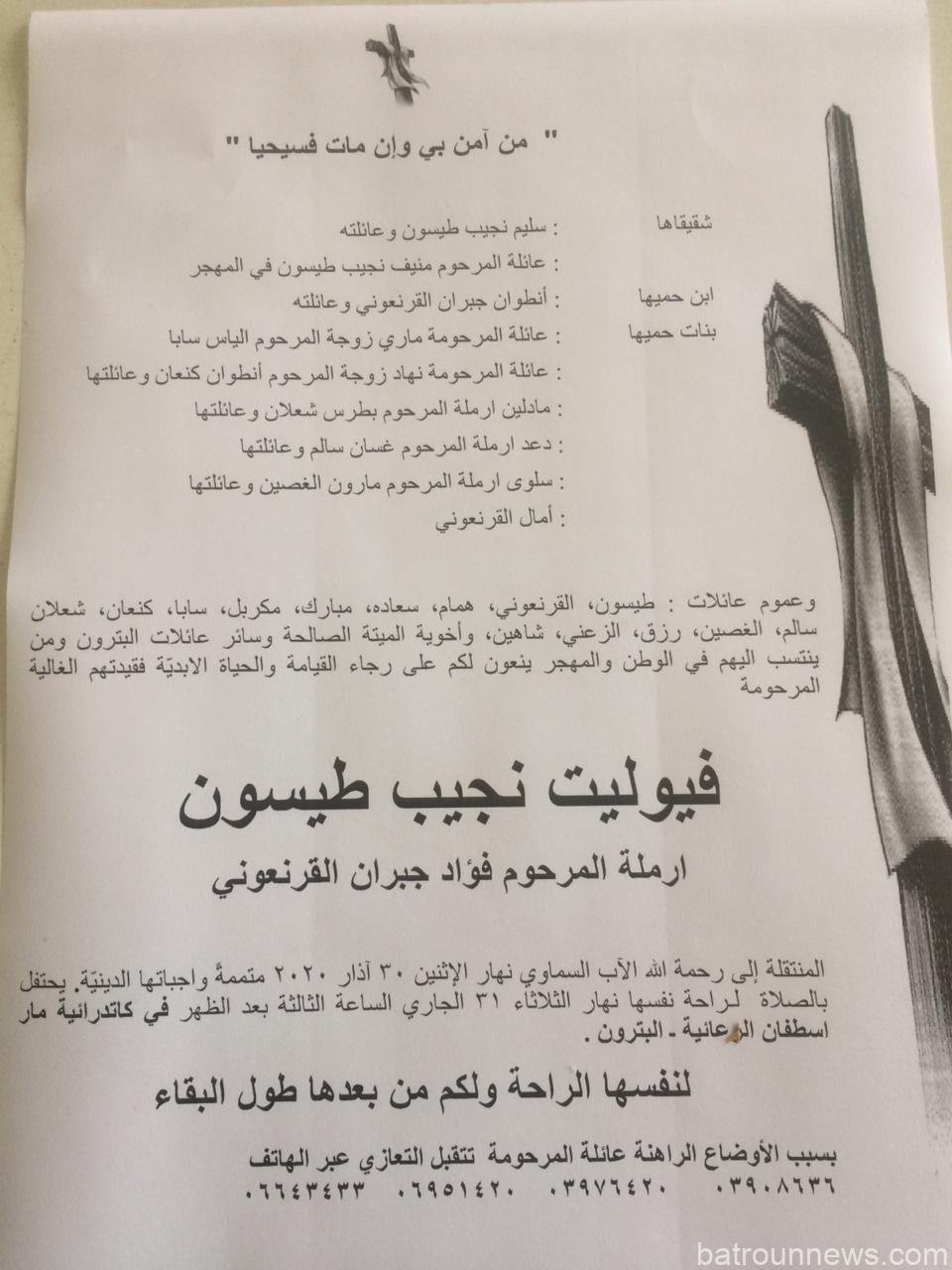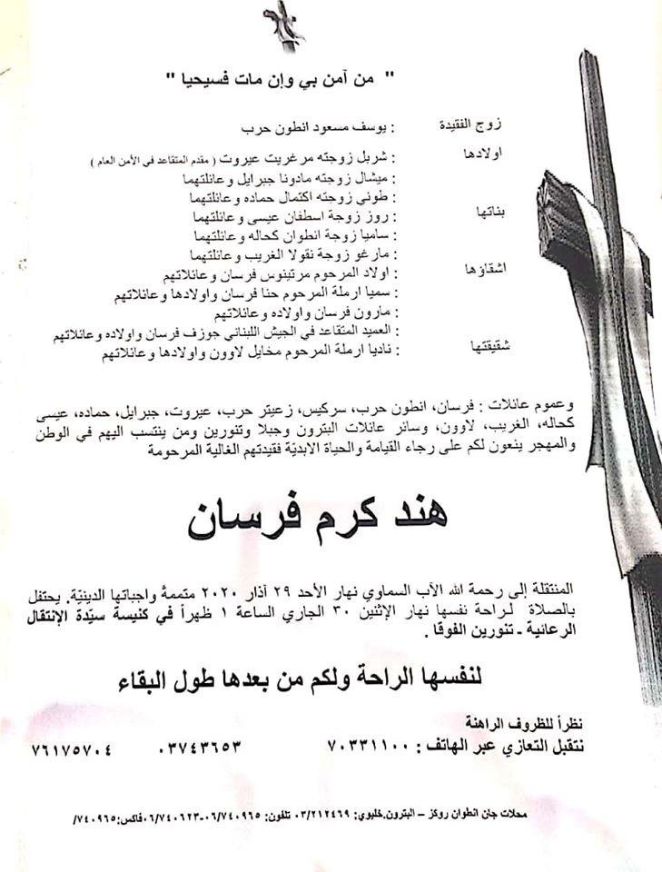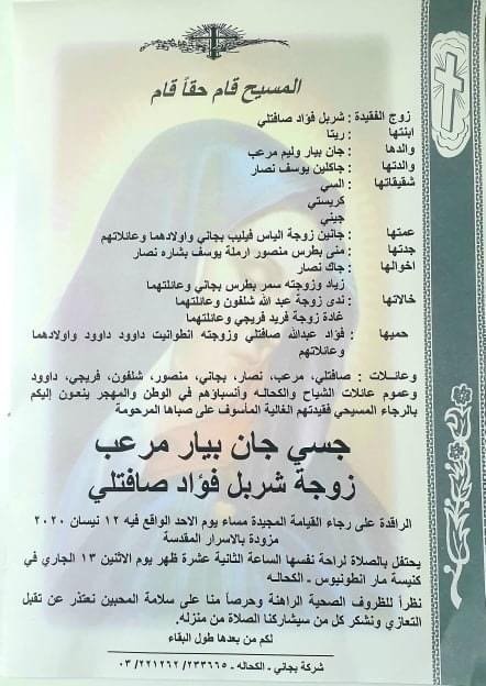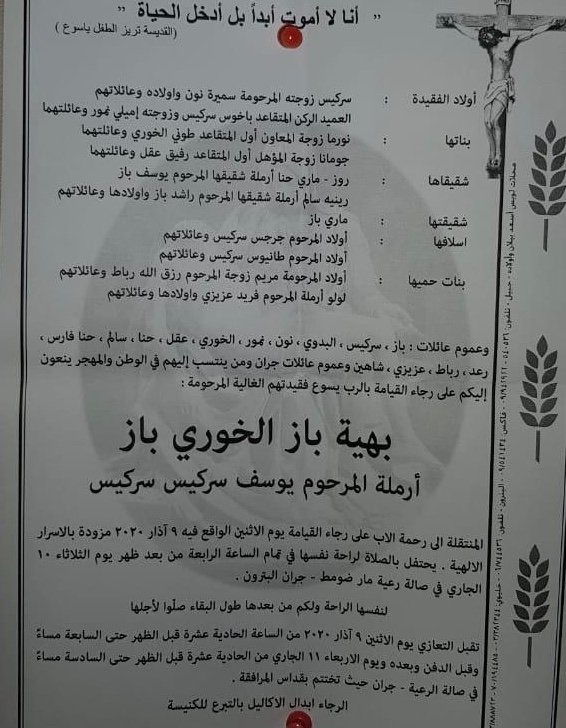 توفيت تريز يوسف أبي سلوم أرملة الشهيد ميشال سركيس الفغالي. الدفن اليوم الجمعة ٢٠ آذار الساعة الثالثة بعد الظهر....