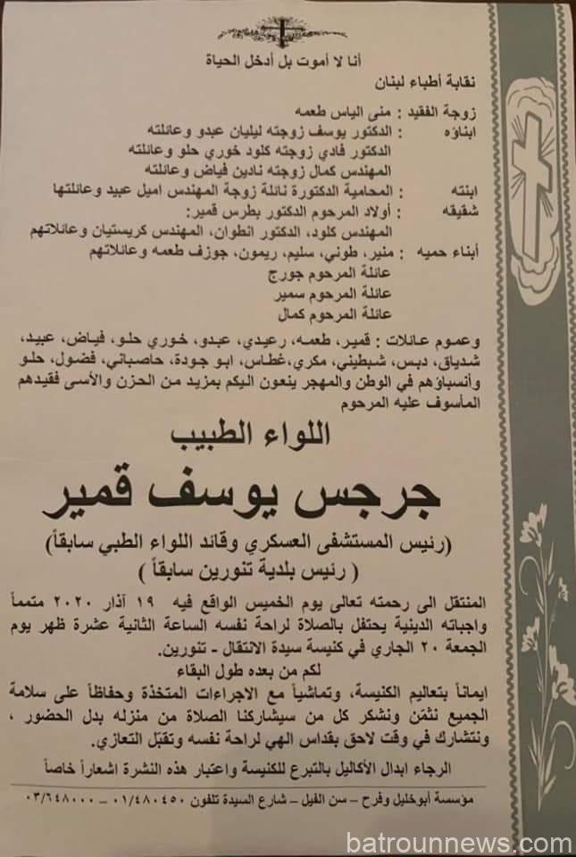 توفي يوسف شاهين ضاهر شديد، في كفرعبيدا الدفن اليوم الثلاثاء ٢٤ آذار الساعة الثالثة بعد الظهر. تقبل التعازي عبر...