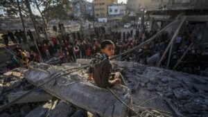 سكان غزة يترقبون وقف إطلاق النار ويخشون مفاجآت اللحظة الأخيرة EPAطفل فلسطيني يجلس على الأنقاض بعد الغارات الجوية الإسرائيلية على مخيم النصيرات للاجئين وسط غزة كان المدنيون في غزة...