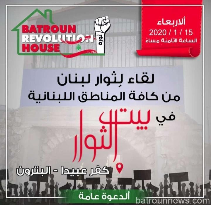 لقاء لثوار لبنان في بيت الثوار كفرعبيدا – البترون وجهت دعوة عامة الى لقاء لثوار لبنان في بيت الثوار كفرعبيدا – البترون، الاربعاء 15-1-2020 الساعة الثامنة مساء.