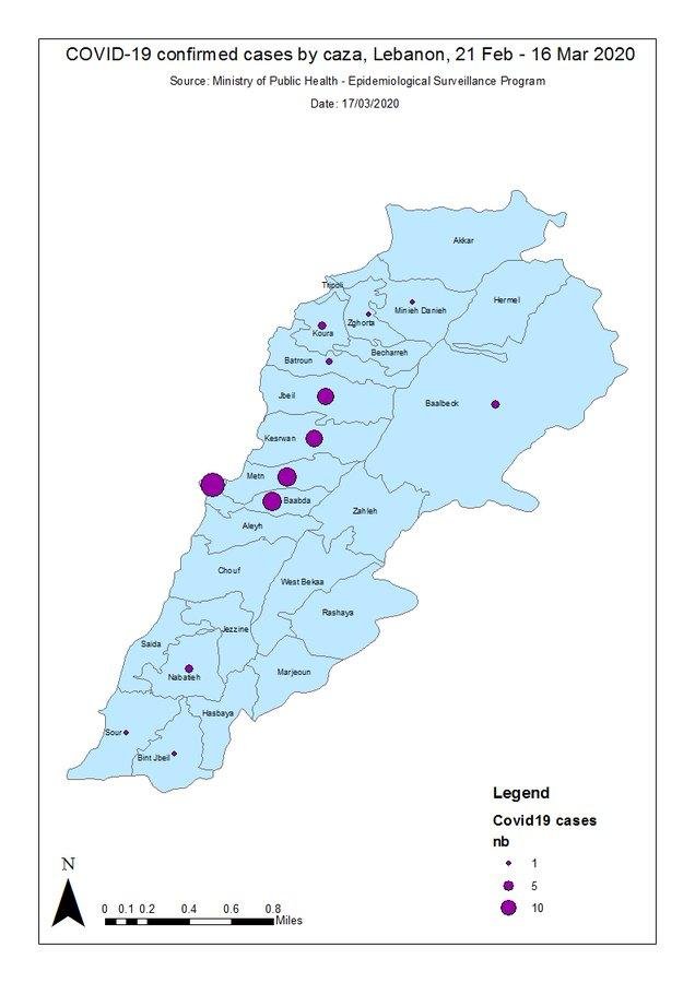 خارطة انتشار فيروس كورونا في الاقضية اللبنانية #COVID-19 confirmed cases by casa, Lebanon, 21 Feb -16 Mar 2020 (revised graph)