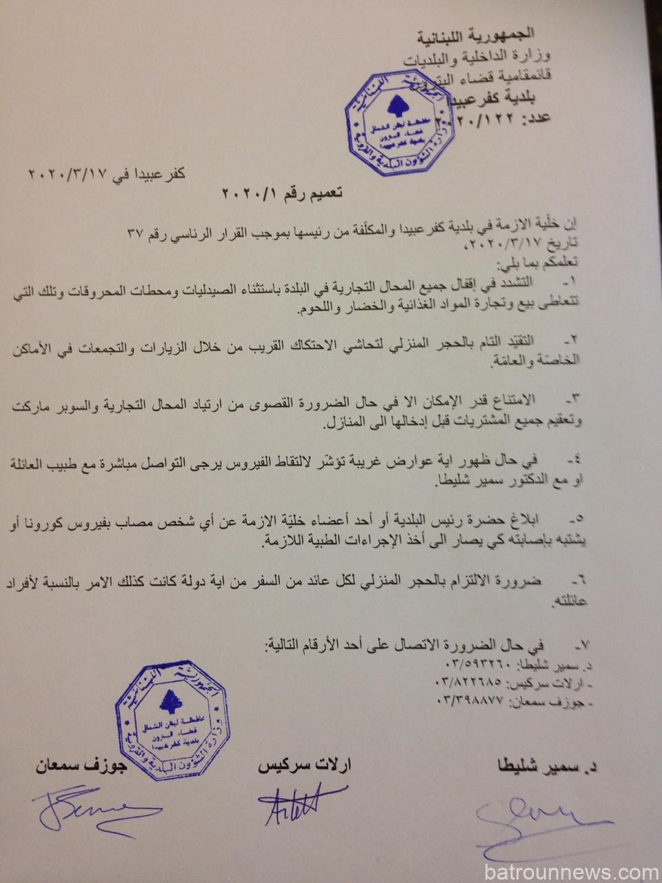 بيان لخلية الأزمة في كفرعبيدا أصدرت خلية الأزمة في بلدية كفرعبيدا – البترون والمكلفة من رئيس المجلس البلدي طنوس الفغالي تعميما أكدت فيه على...